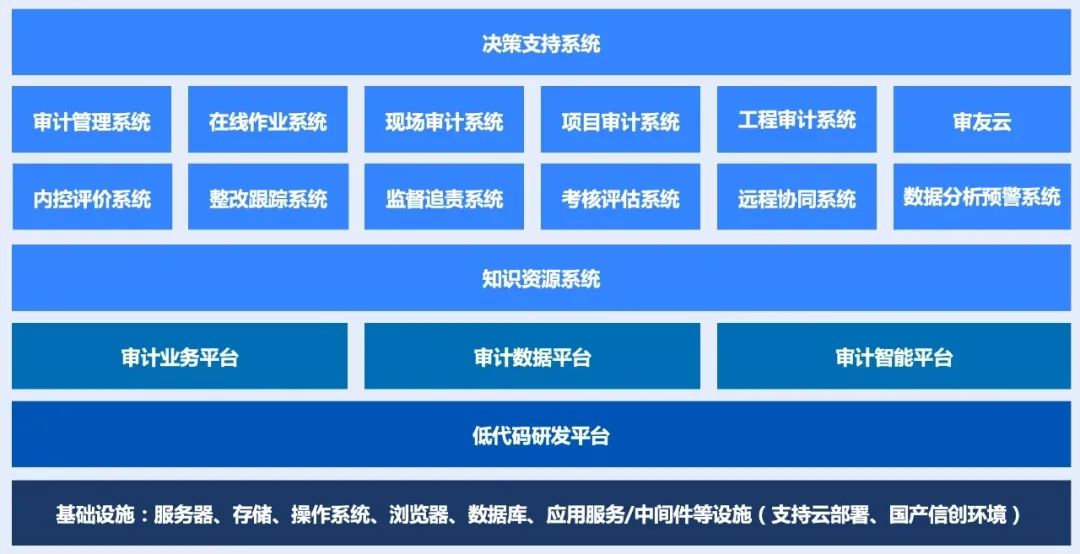 審友A8新一代數智化審計平臺為“1+3+N”總體架構,包括:1個低代碼研發平臺、3個業務支撐平臺(審計業務平臺、審計數據平臺、審計智能平臺)、N個業務應用系統( 知識資源系統、審計管理系統、在線作業系統、數據分析預警系統、決策支持系統等 )。